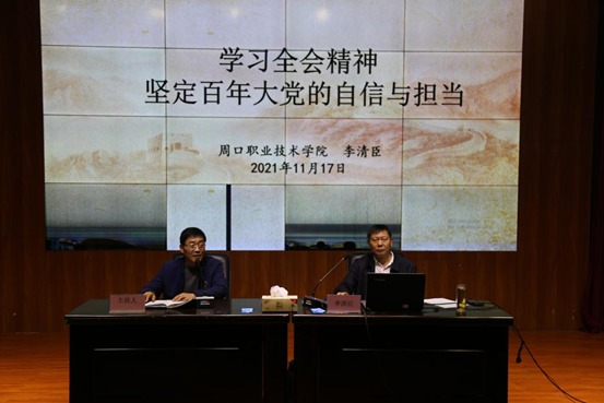 11月17日下午,校长李清臣教授前往文昌校区以《学习全会精神,坚定百年大党的自信与担当》为题为谈球吧体育app下载、护理学院全体党员干部作党的十九届六中全会精神专题辅导报告。学校党政办、组织部、宣传部等职能部门负责人参加专题辅导。谈球吧体育app下载党总支书记周文一主持报告会。