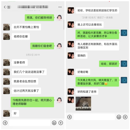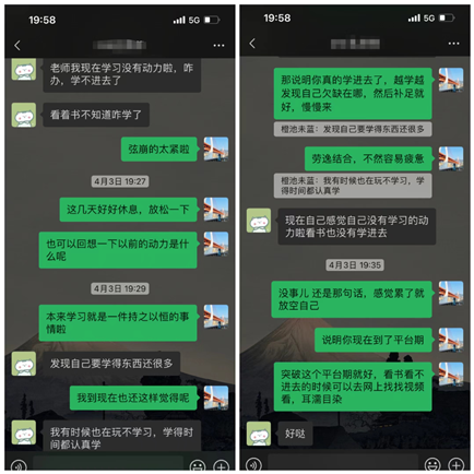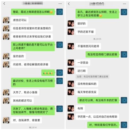 深入沟通,打造示范引领新高地。“最近学习如何?知识点都能掌握吗?”,“今晚在寝室么我来找你聊聊天”,“最近身体怎么样?今天天气不错记得晒晒被子”,辅导员们充分利用QQ、微信、腾讯会议线上班会、主题党日团日活动等平台,与学生聊生活、聊学习,引领学生思想并传播正能量。以自身为示范发挥先锋模范作用,激励学生做到勇于担当、共克时艰。