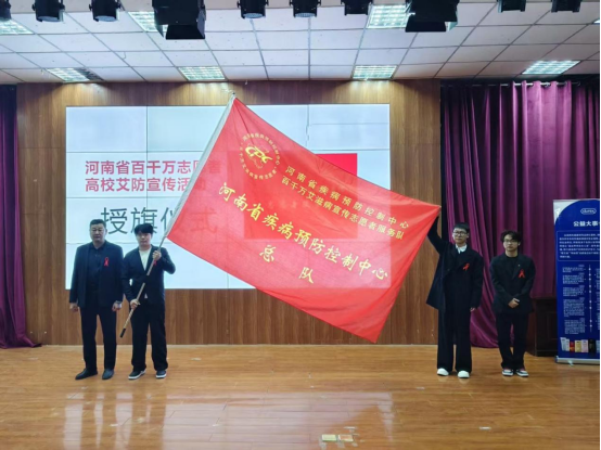 周口市疾控中心艾防科科长姚明春为防艾志愿者授旗。旗帜不仅是象征更承载着防艾的理想与希望,激励志愿者们在科学防治、同伴教育和社会动员中发挥更大作用。